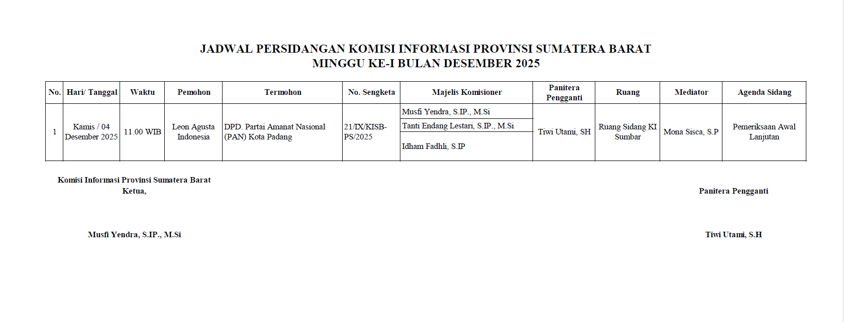 Jadwal Sidang, Kamis 04 Desember 2025, Pemeriksaan Awal Lanjutan, Leon Agusta Indonesia dengan DPD Partai PAN Kota Padang Jadwal Sidang Sengketa Admin 03 Desember 2025 08:20:12 WIB 7 DOWNLOAD FILE